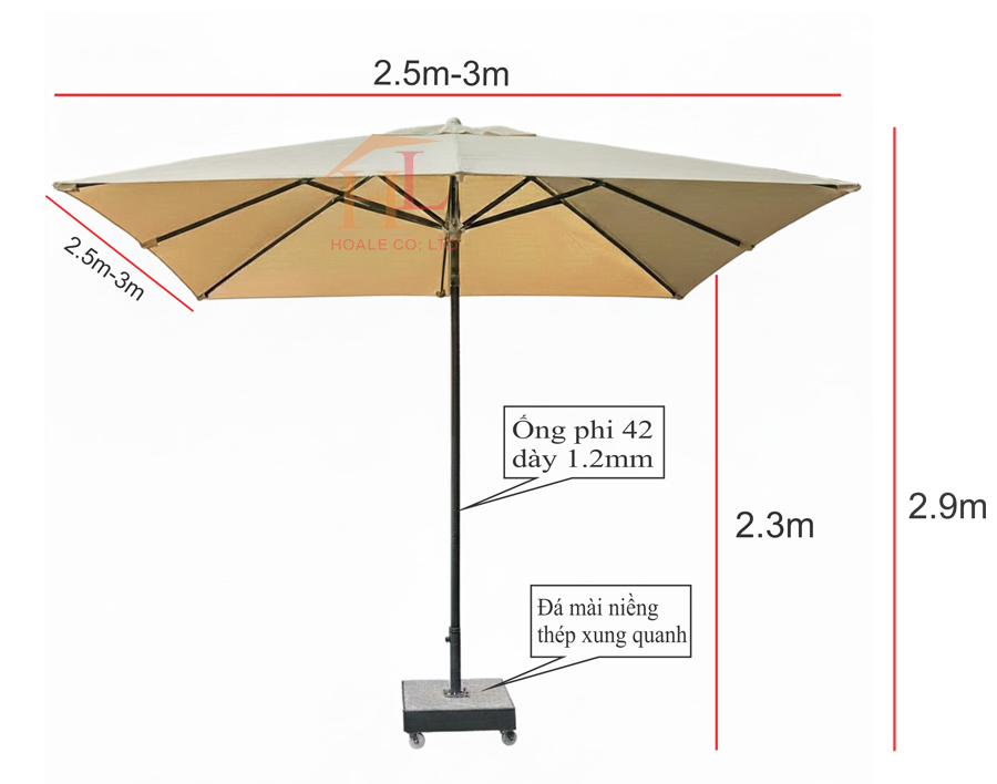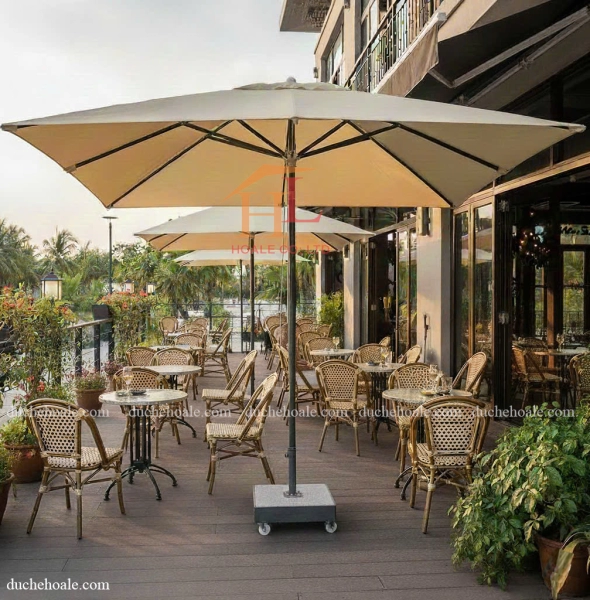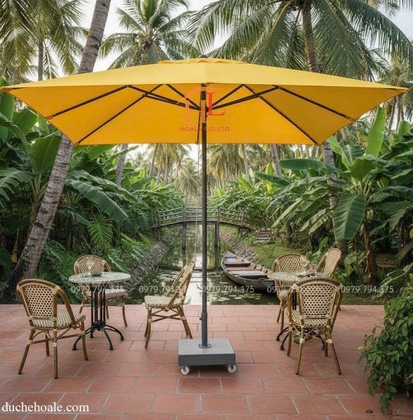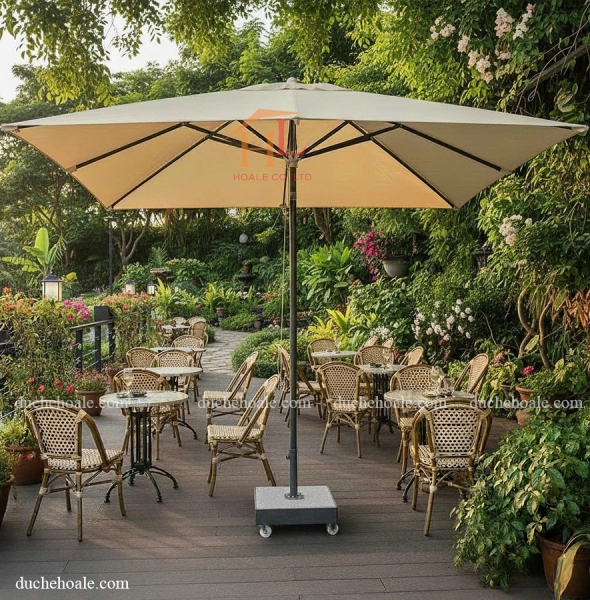 Dù che nắng đúng tâm vuông là loại dù che có trụ đặt chính giữa tán dù, đồng thời phần tán dù che được thiết kế theo dạng hình vuông. Kiểu dáng này mang lại khả năng che nắng đều bốn phía, tạo sự cân đối và vững vàng khi sử dụng ngoài trời.
