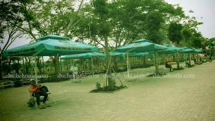 Khu công viên được lắp đặt dù lệch tâm vuông 3m x3m trải dài toàn sau lưng ghế tạo bóng mát để du khách nghĩ ngơi và thư giản thỏa mái hơn.