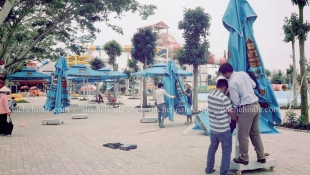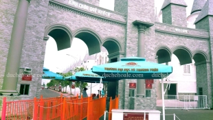 Tạo điểm nhất nổi bật với những chiếc dù che nắng lắp đặt ngay cổng ra vào chính của khu vui chơi.