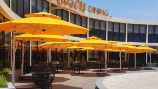 Không gian luôn bừng sáng với những chiếc dù che nắng lệch tâm vàng tươi rực rõ.