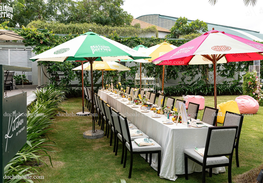 Khách hàng có thể thoải mái ngồi thư giãn bên hồ bơi, thưởng thức trà chiều ngoài trời hay đọc sách dưới bóng râm mát. Những chiếc dù che nắng hồ bơi vừa che nắng hiệu quả, vừa tạo không gian nghỉ ngơi thoáng đãng và sang trọng.